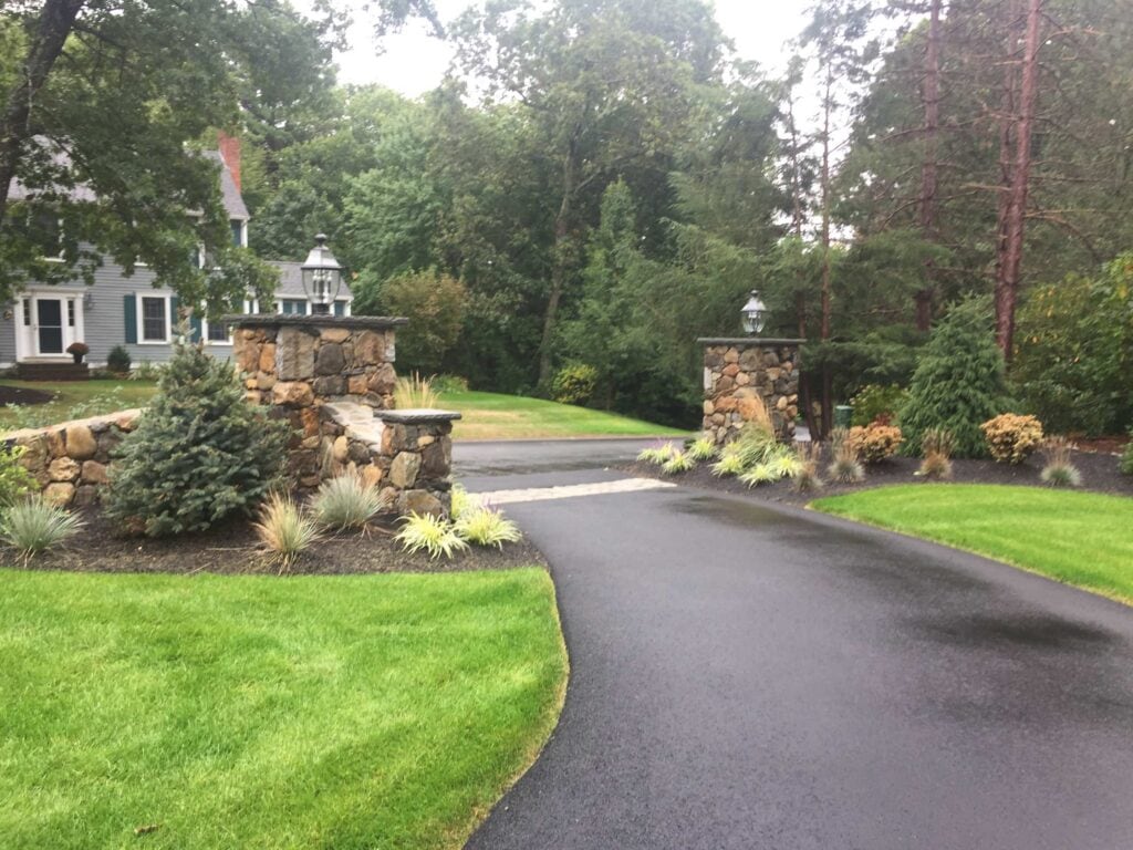 4. Asphalt driveway entrance with veneer stone pillars.