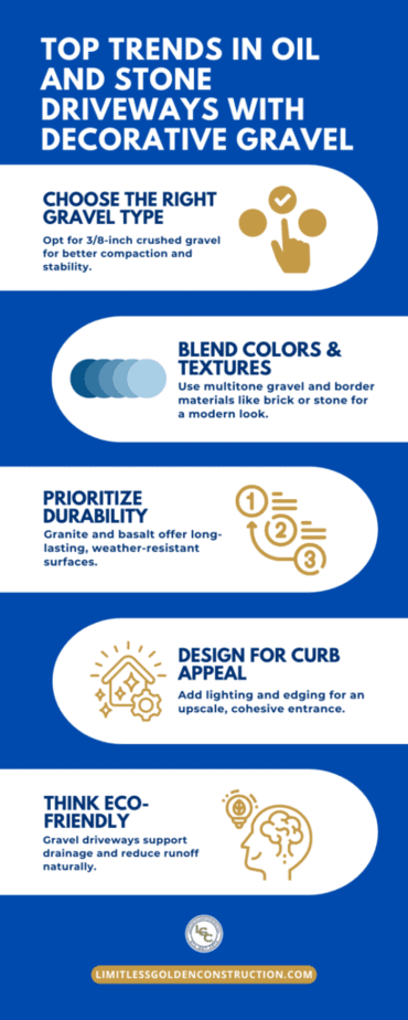 An oil and stone driveway enhanced with decorative gravel creates a strikingly inviting gateway. Many property owners are gravitating toward combining fine-textured gravel with contrasting borders, such as brick or stone edging, to frame the area while controlling loose material.